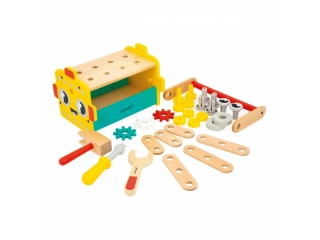 Con esta caja de herramientas de juguete, los niños a partir de 3 años podrán disfrutar de un divertido juguete de construcción modular. ¡Es el soporte ideal para estimular su creatividad y motricidad, jugando a hacer bricolaje. Este juego de construcción ofrece todo lo necesario: 3 herramientas (destornillador, llave inglesa y martillo), 13 piezas de madera (tablas y engranajes) y 14 piezas de tornillería (tornillos y clavos). ¡Son 30 accesorios en total! Con todo eso, los niños se inventan todas las ingeniosas máquinas que quieran trabajando la destreza y dando rienda suelta a la imaginación. Además, los tornillos tienen muescas para parecerse aún más a los de verdad y ofrecer una experiencia de juego realista a los más pequeños. El otro punto fuerte de esta caja de herramientas infantil es su asa extraíble: ¡también se puede montar y desmontar! Con ella, el transporte es sencillo. Sin el asa, este juego de bricolaje se convierte en un banco de trabajo compacto de madera sobre el que fijar todo tipo de elementos!