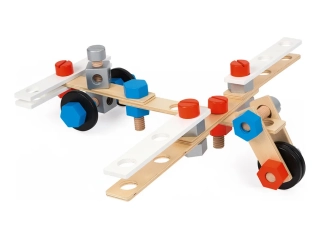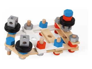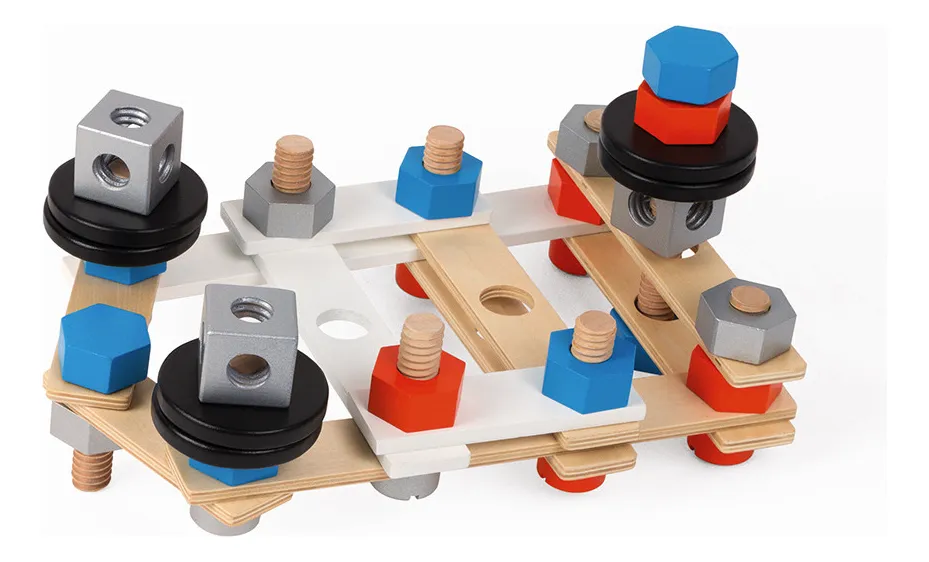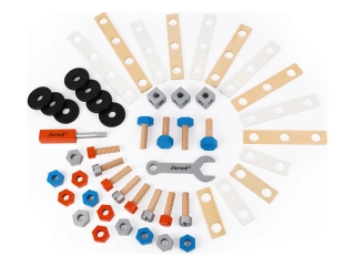 Este juego contiene 50 accesorios: 7 arandelas ( Ø58x8 mm) + 2 placas con 4 agujeros ( 230x30x6 mm ) + 8 placas con 3 agujeros ( 170x30x6 mm ) + 4 placas con 2 agujeros ( 100x30x6 mm ) + 12 tuercas hexagonales ( 34x30x15 mm ) + 3 tuercas cúbicas ( 30x30x30 mm ) + 4 tornillos ( 34x65 mm ) + 8 tornillos ( Ø24x65 mm ) + 1 destornillador ( 140x20x26 mm ) + 1 llave ( 155x50x10 mm ). Material(es): Madera (MDF, cerezo y contrachapado)