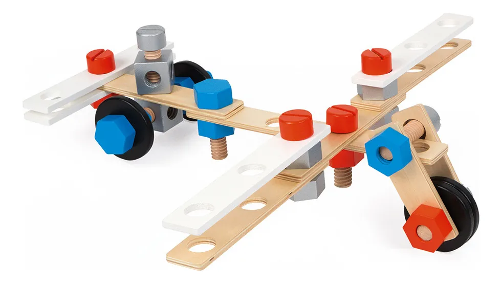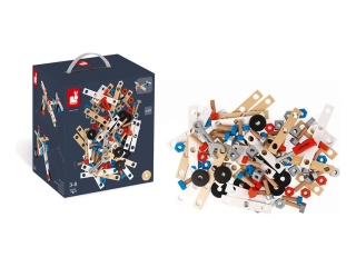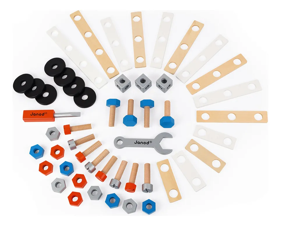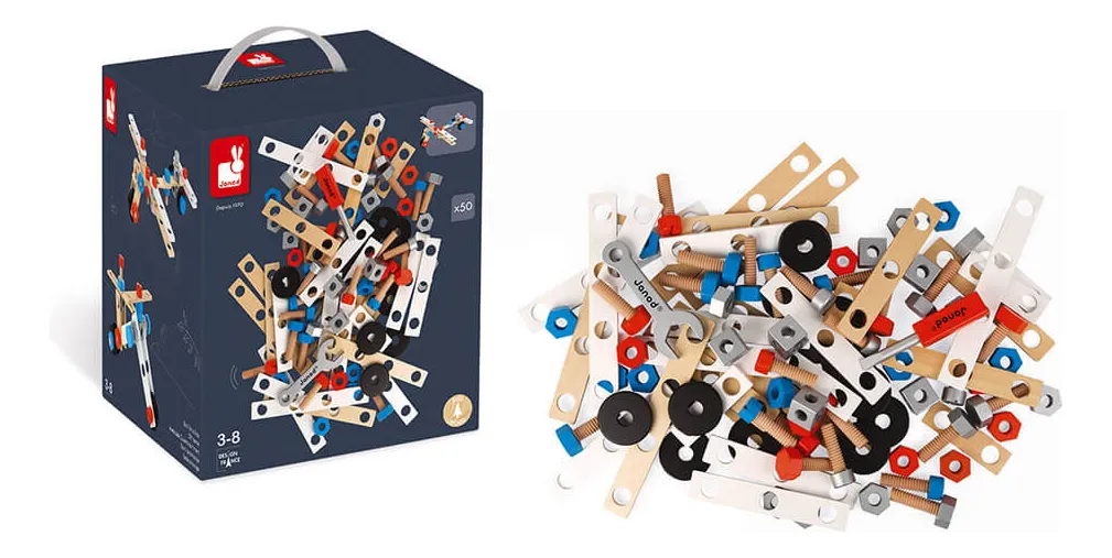 barril bricolaje janod, set de construcción madera janod, juego de bricolaje infantil, barril 50 piezas janod, juguetes creativos janod, juego educativo de construcción, janod uruguay juguetes, set herramientas madera niños