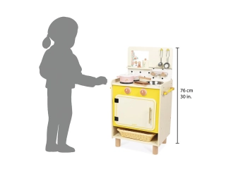 El tamaño de esta cocinita es de 45 x 29,5 x 76 cm. La cocina también está equipada con un horno con mandos giratorios y puerta magnética, un fregadero con mandos giratorios para el grifo, bandejas para hornear, dos portas, paños de cocina y una ventana.