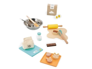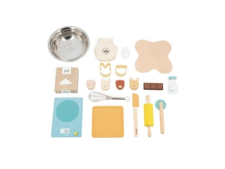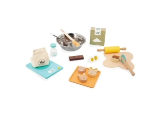 Cuenta con un conjunto de accesorios de madera: balanza de madera, una caja de azúcar de cartón, una bolsa de harina de tela, una botella de leche de madera, un huevo con cierre de velcro y una barra de chocolate viene incluidos en este kit de pastelería.