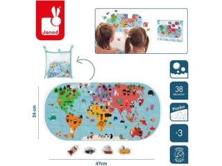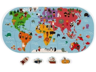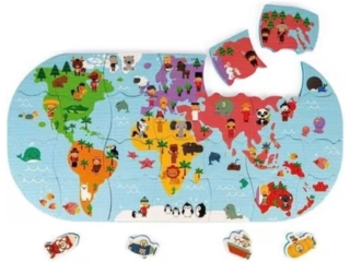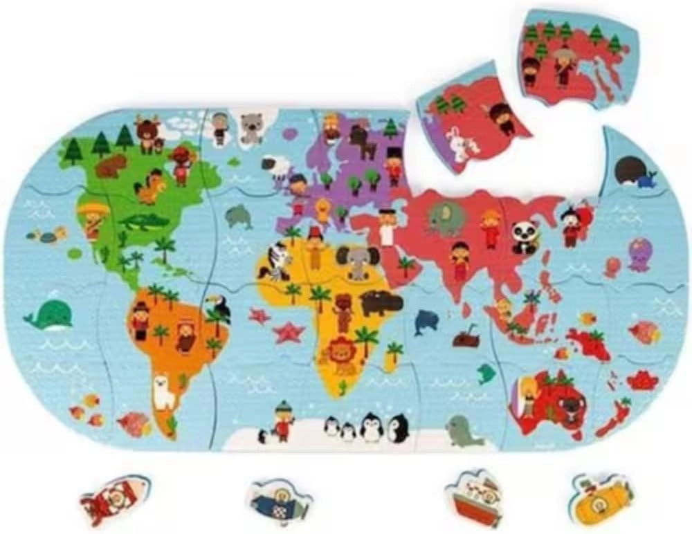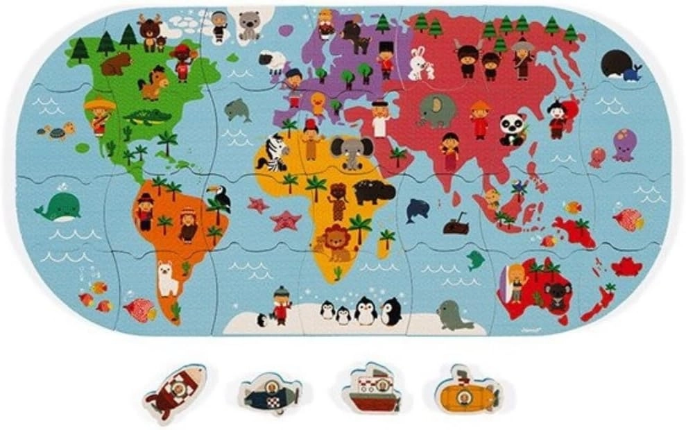 • DESCUBRIR EL MUNDO Y LA GEOGRAFÍA: Todo listo para dar la vuelta al mundo y conocer los distintos continentes, los animales y los habitantes de todos los países. Pandas, cocodrilos, osos o esquimales: el niño conocerá sus entornos naturales y se convertirá en todo un experto en la geografía y cultura de todos los países del mundo. Una vez hecho el mapa, es hora de emprender la aventura. Para ello, se incluyen cuatro figuritas de vehículos: el barco, el submarino, el avión y el cohete, con los que el niño puede desplazarse por el mapa del puzle dejándose llevar por la imaginación.
