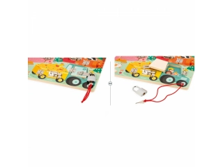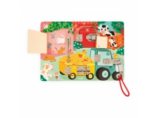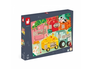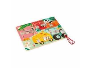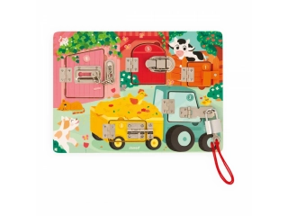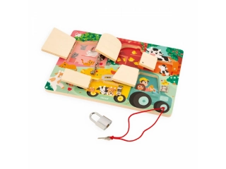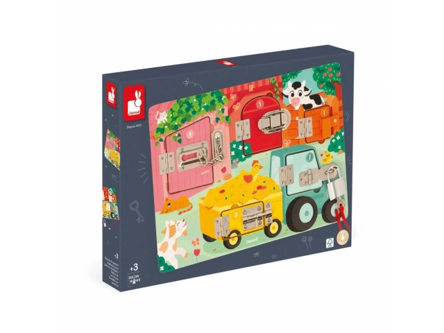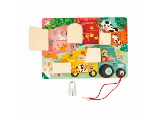 Cerraduras, cerrojos, llaves? los niños disfrutarán un montón descubriendo, pensando y experimentando con los animales de la granja en su propio tablero de cerraduras! Para descubrir todos los secretos de este bonito busy board de madera, habrá que conseguir abrir las cinco puertas cerradas con cinco sistemas distintos: ¡llave, pestillo, cadena de seguridad, cierre de palanca y cerrojo! Cada puerta tiene su propio color y su propio número, ¡que se corresponde con el número de crías de animales que se esconden tras la puerta! ¡Un montón de formas distintas de divertirse! Aprender los colores, los números, conocer a los animales de la granja y sus bebés y ejercitar la destreza y la lógica. Esta preciosa tabla de actividades educativa de madera FSC® es ideal a partir de 3 años. Dimensiones: 34,6 x 2,8 x 24,8 cm. Material(es): Madera (contrachapado), metal.