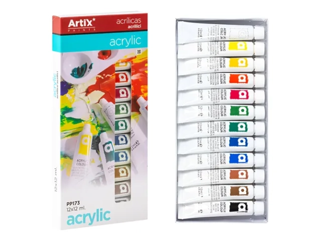 pinturas acrílicas, artix, set 12 colores, pintura artística, acrílicos 12ml, materiales de arte, manualidades, arte escolar, copymas, colores acrílicos