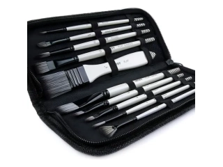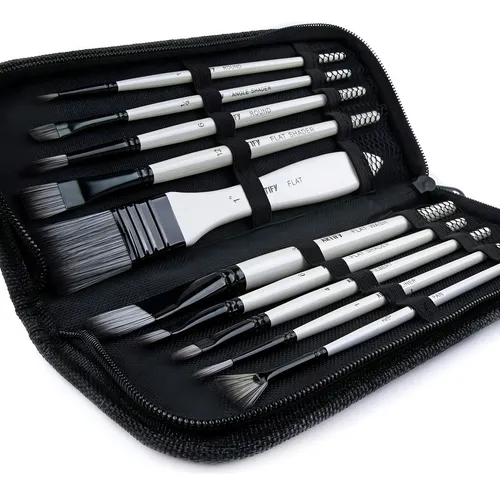 Estuche con cierre de 10 pinceles de mango corto PRESTIGE PREMIUM. Fibras sintéticas de calidad artística. Set compuesto por: 1 Abanico (#2/0), 1 Angular (#1/4), 1 Lengua de gato (#4), 4 Planos (#1, #3/4, #6, #12), 2 Redondos (#1, #6), 1 Delineador (#1). Aptos para todo tipo de pinturas. (Acrílico, óleo, acuarela)